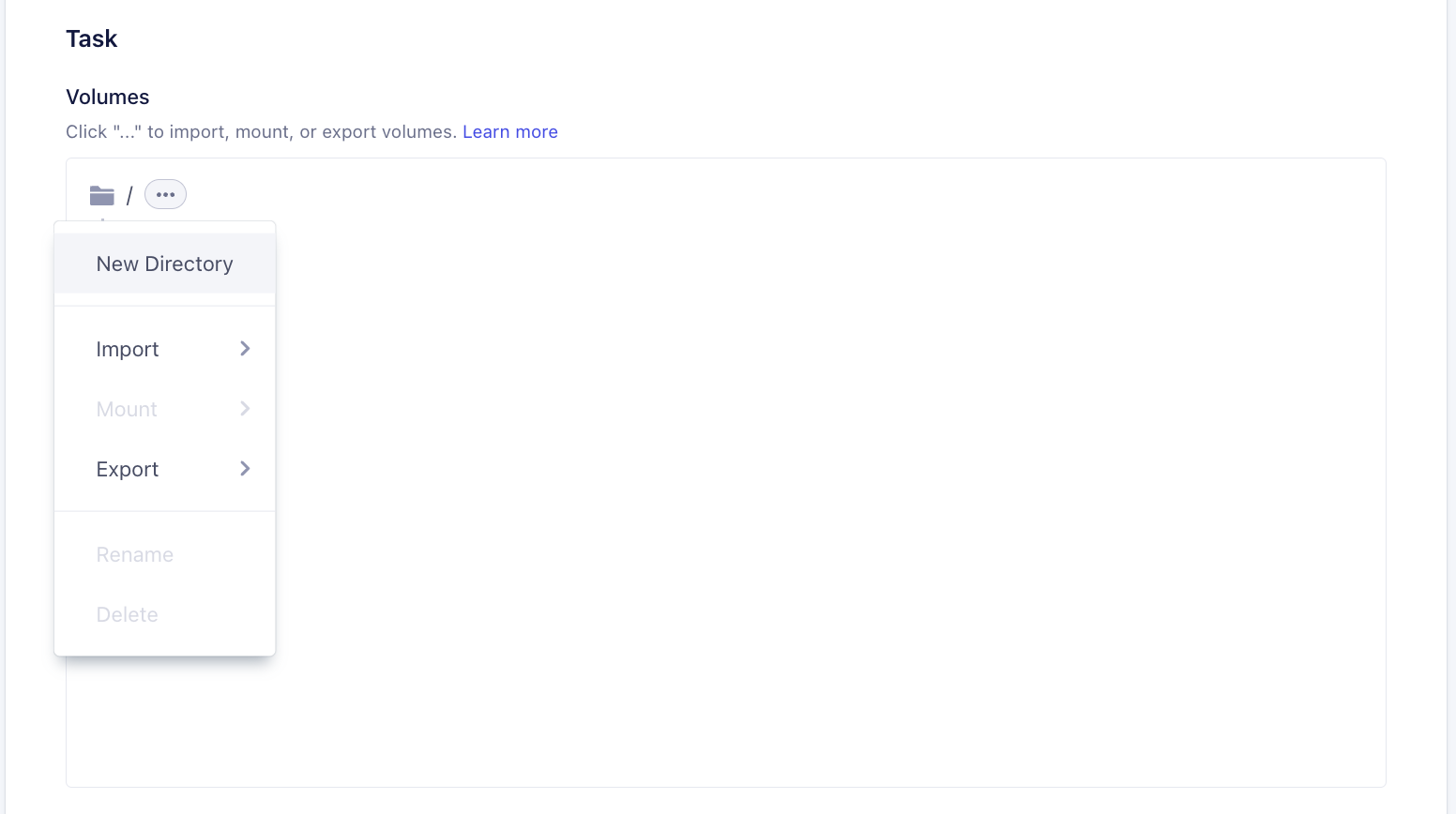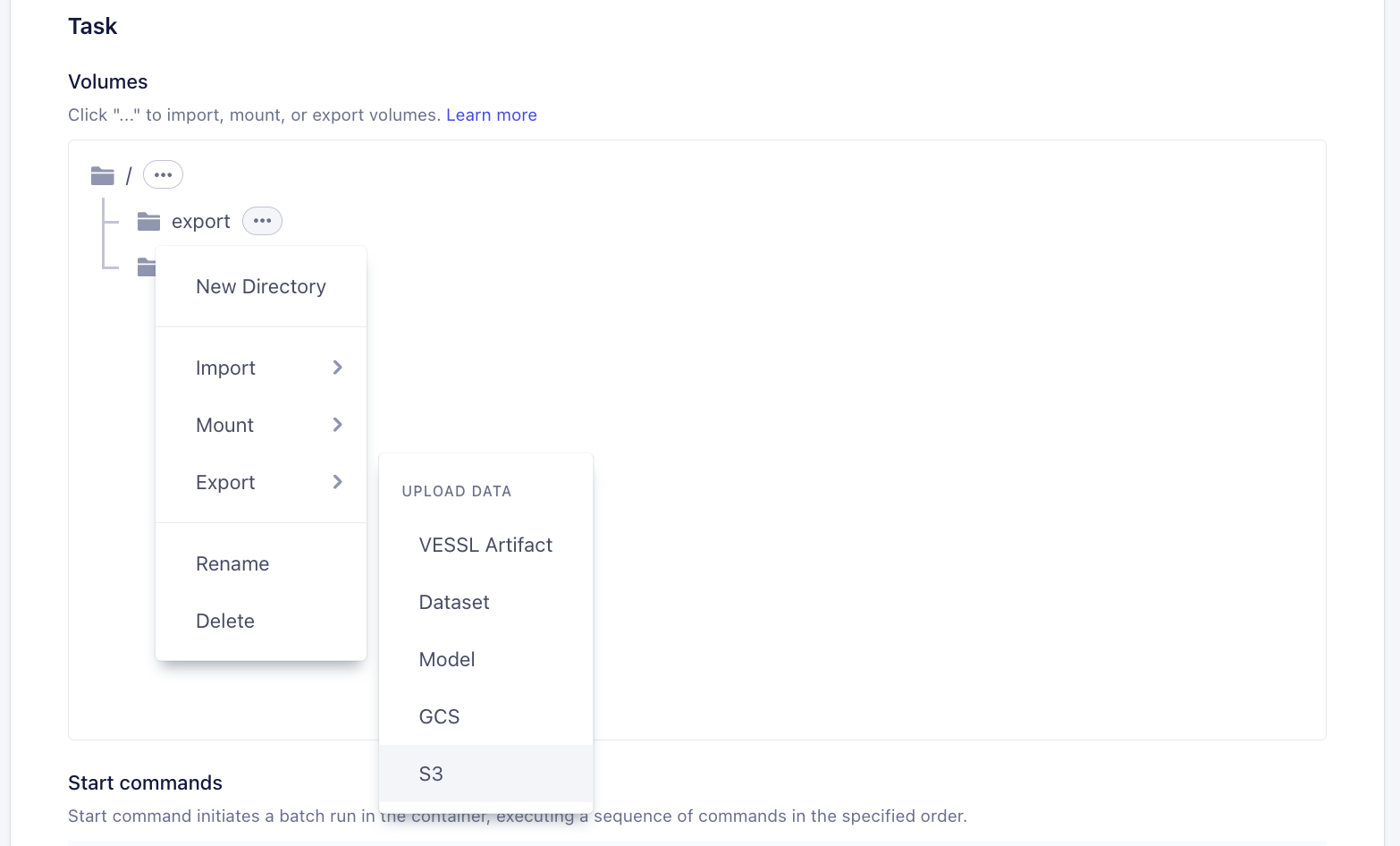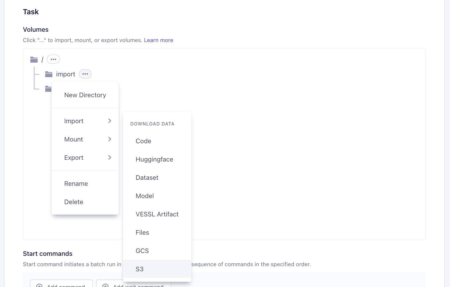 Task > Volumessection, click context menu andImport/Export > S3 / GCP. You can create a new directory for the import / export to work.