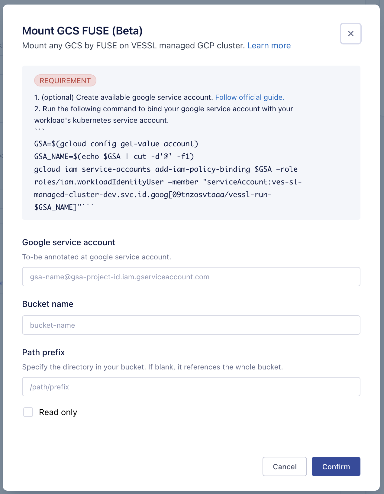 - Follow the guide on the popup to create and bind your google service account with our VESSL managed GCP cluster.