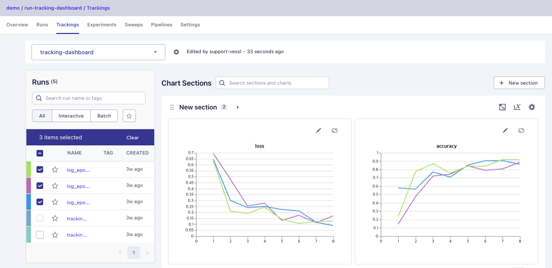 vessl.log() with our YAML to (1) launch multiple jobs with different hyperparameters, (2) track the results in realtime, and (3) set up a shared experiment dashboard for your team.