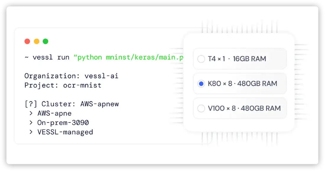 VESSL Cluster enables seamless scaling of containerized ML workloads from a personal laptop to cloud instances or Kubernetes-backed on-premises clusters.