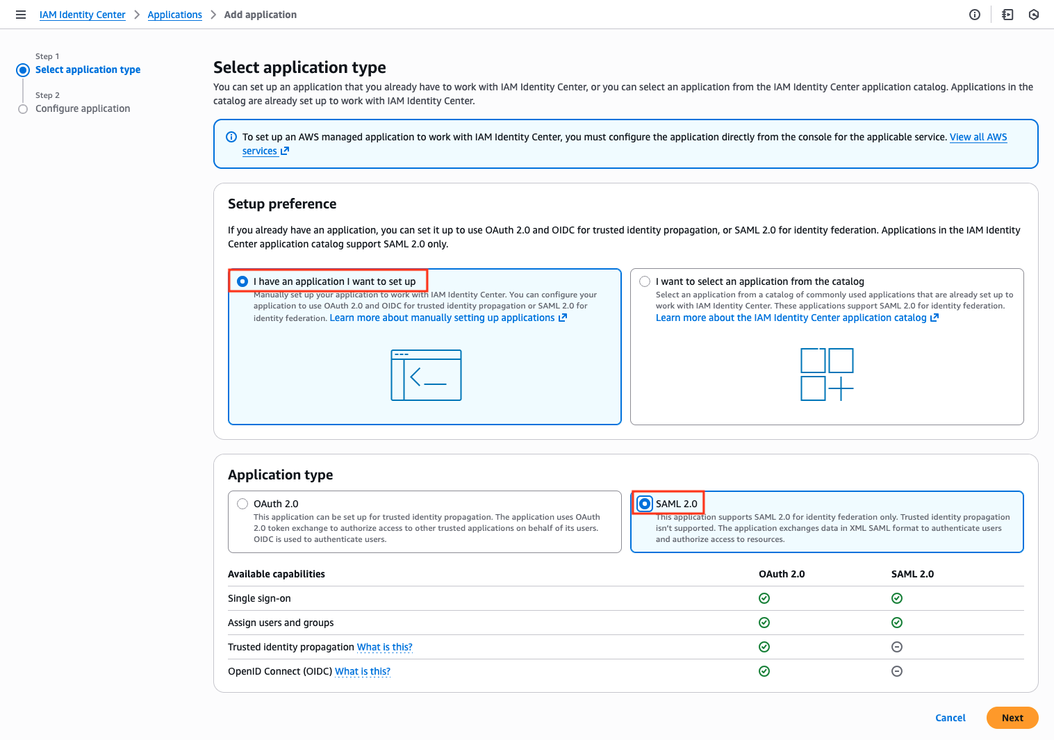 Return to the Overview page and click 2. Set up single sign-on. Select SAML as the sign-on method.