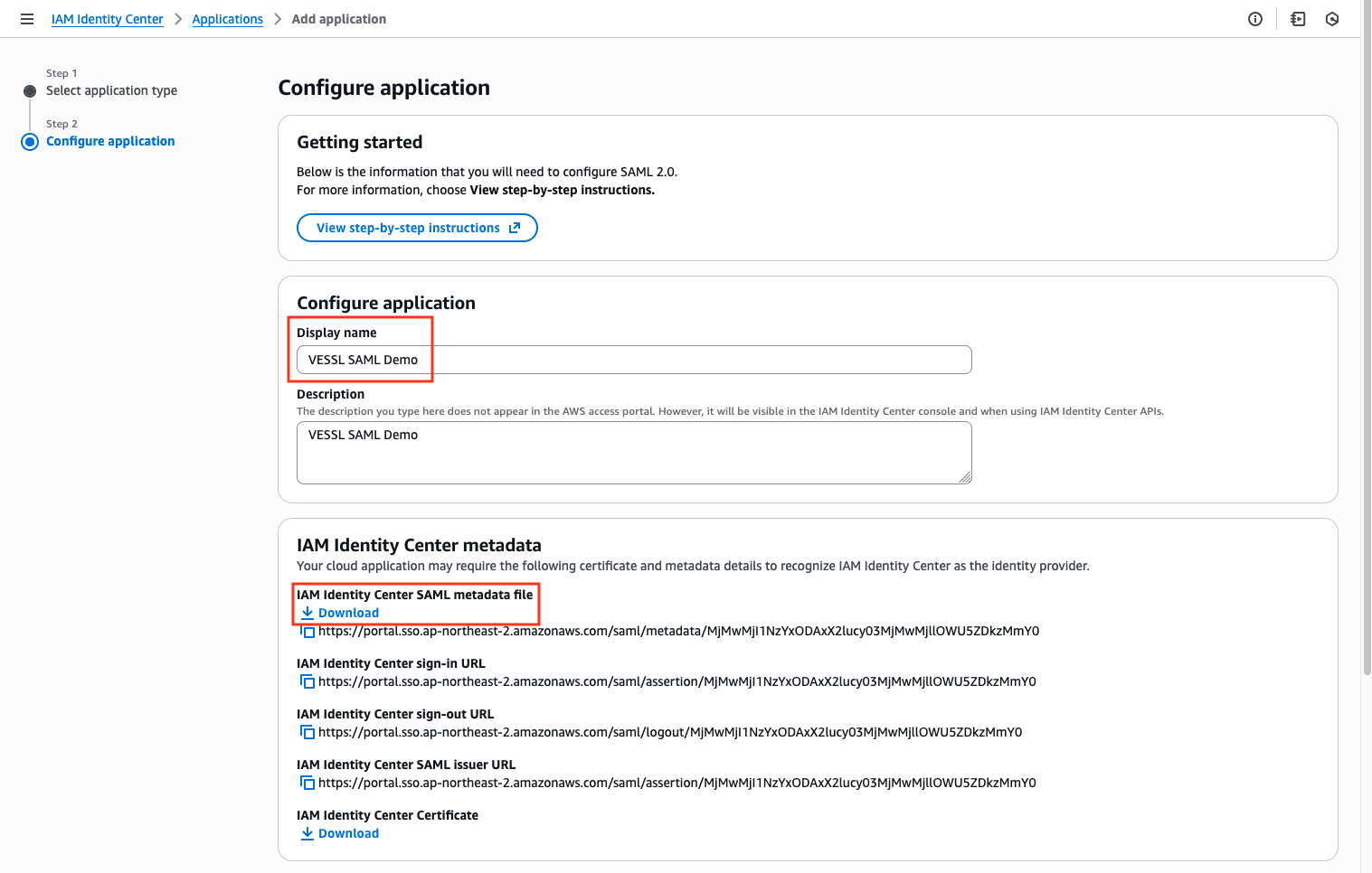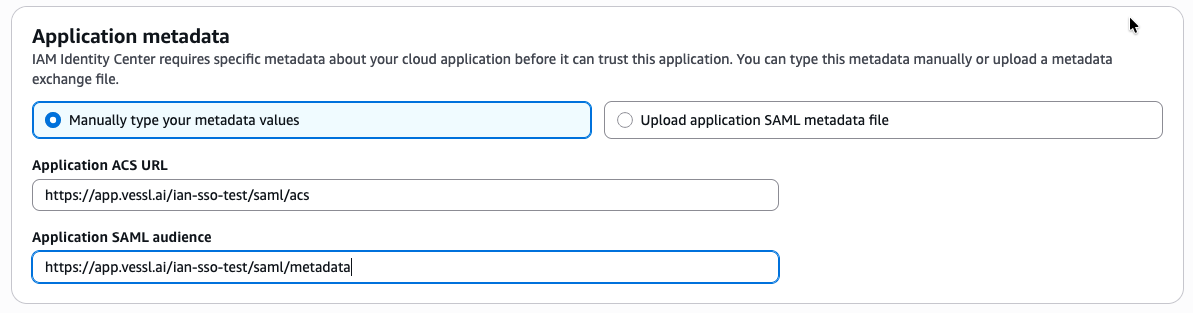 | Metadata XML | Paste contents of the downloaded IAM Identity Center metadata file |