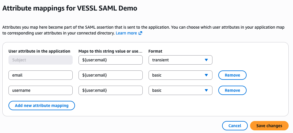 Identity providers (IdPs) use attributes to supply user ID and email information. VESSL requires these attributes to retrieve the corresponding user data during authentication. Ensure you configure the correct attribute names based on your identity provider. Refer to the details below to fill in the required fields:- Microsoft Entra