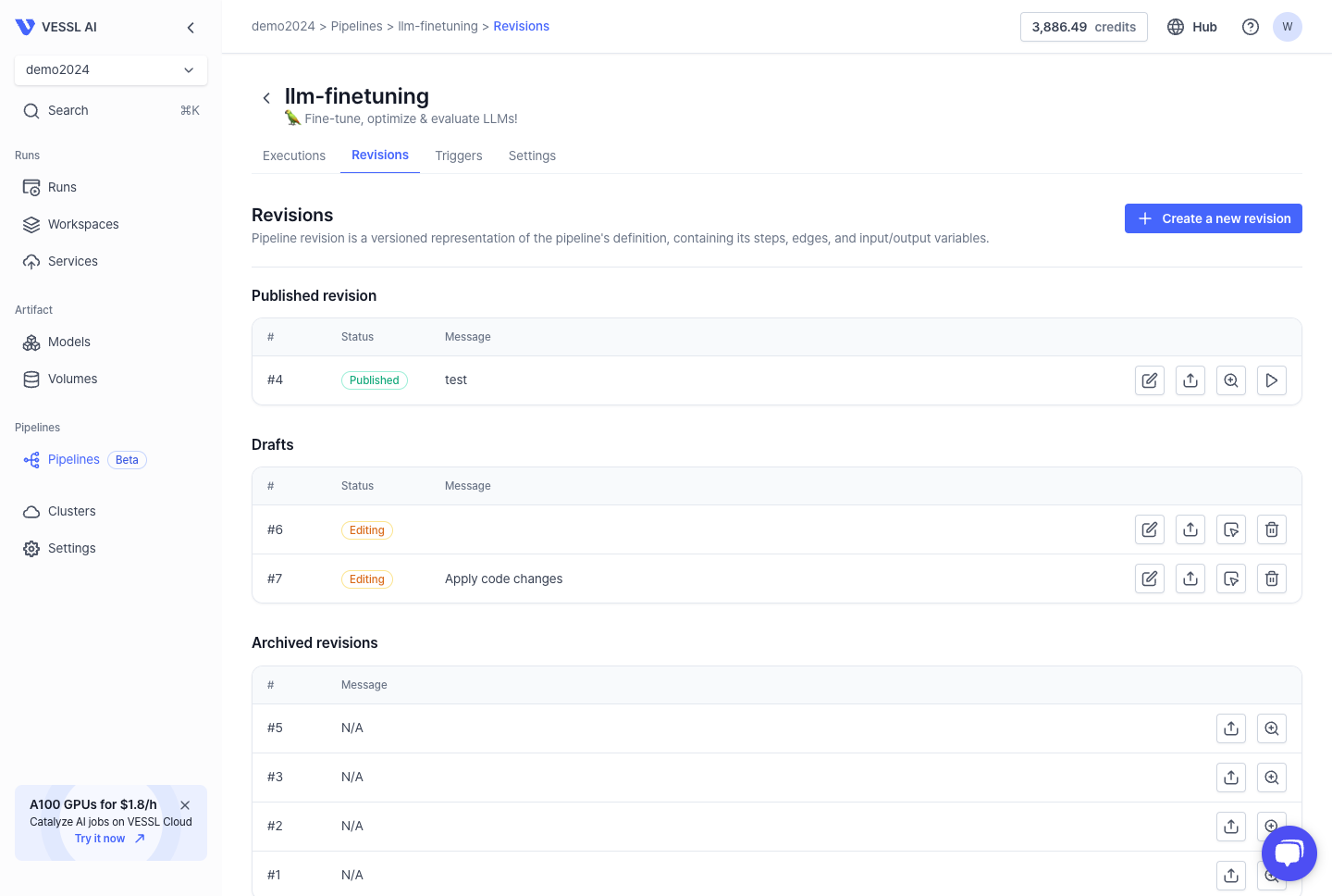The Revisions dashboard offers an overview of the revision statuses. It enables you to modify a specific version of a pipeline that consists of a series of steps.