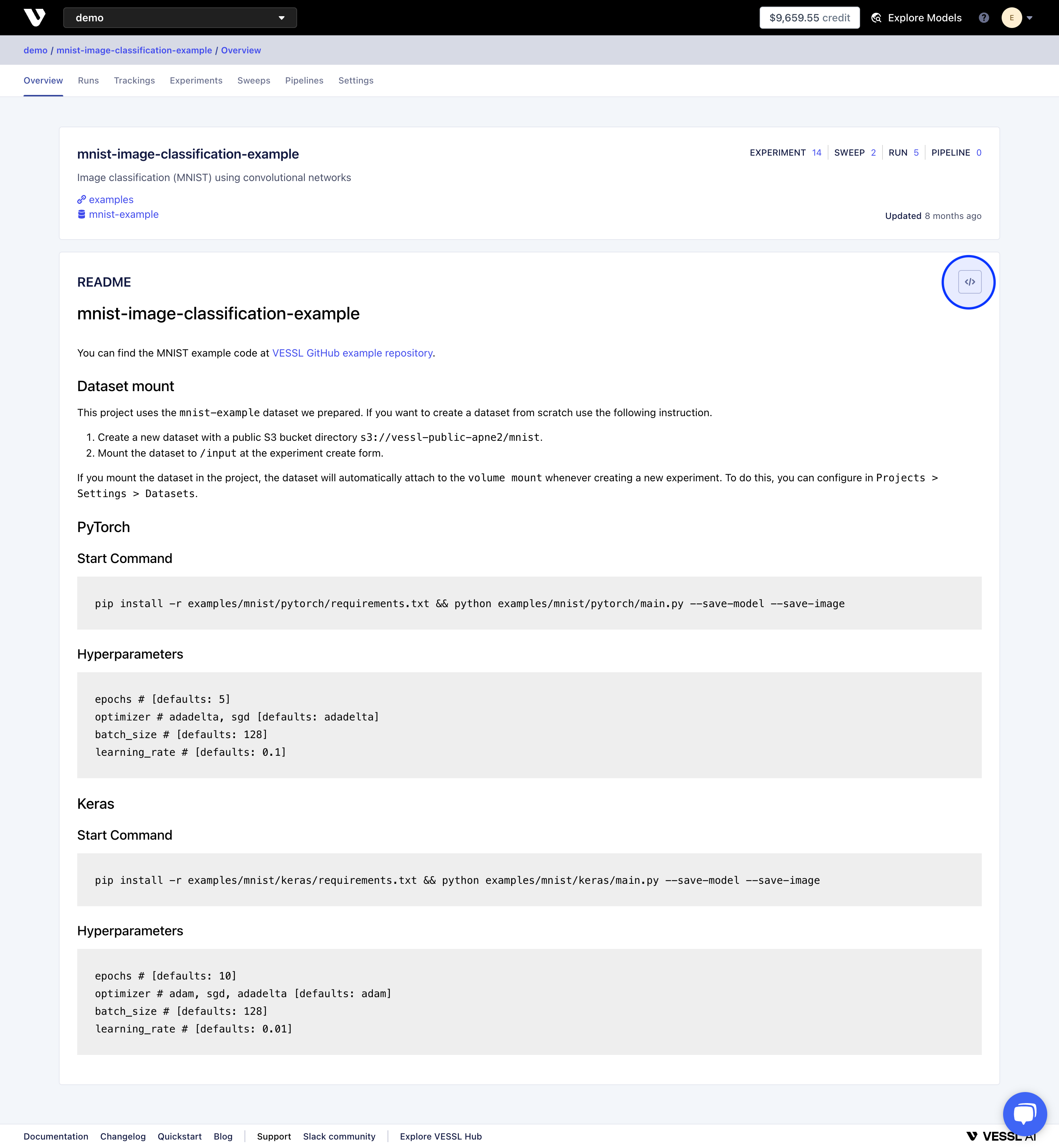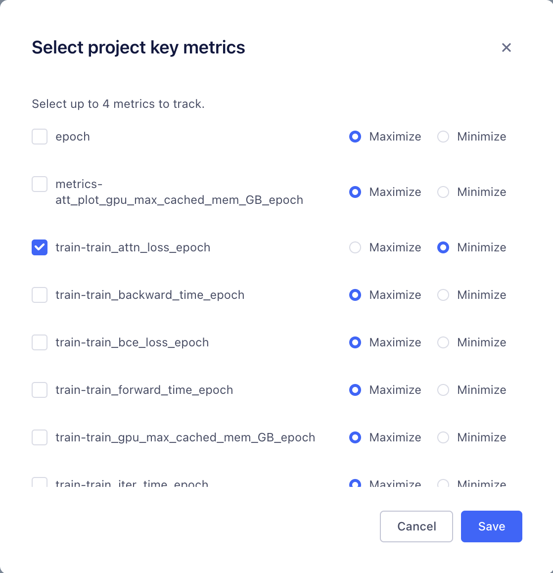 VESSL automatically marks metrics of best-performing experiments as key metrics. You can also manually bookmark key metrics and keep track of your model’s meaningful evaluation metrics. To add or remove Key Metrics- Click the settings icon on top of the Key Metrics card.