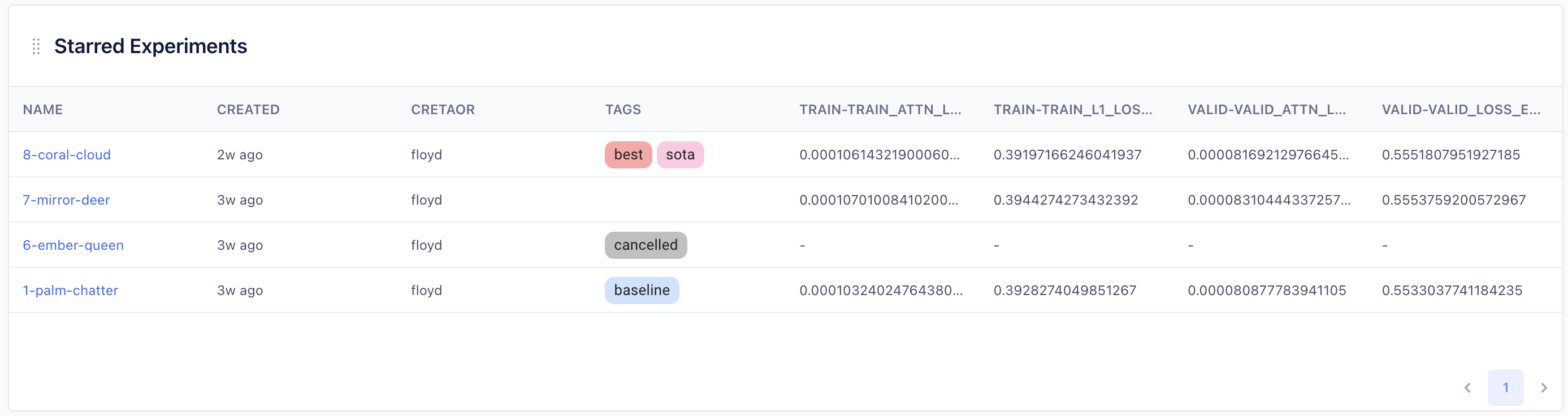You can mark important experiments as Starred Experiments to keep track of meaningful achievements in the project. Starred Experiments displayed with the tags and key metrics.