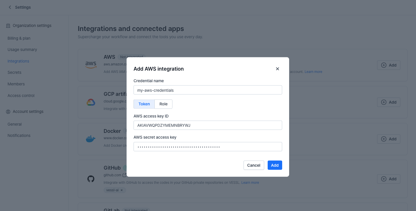 VESSL supports AWS S3 and Google Cloud Storage as external cloud storage options. Follow the steps below to integrate cloud storage:1