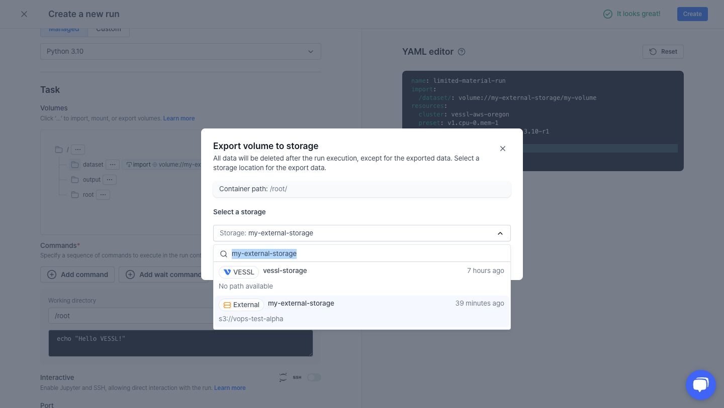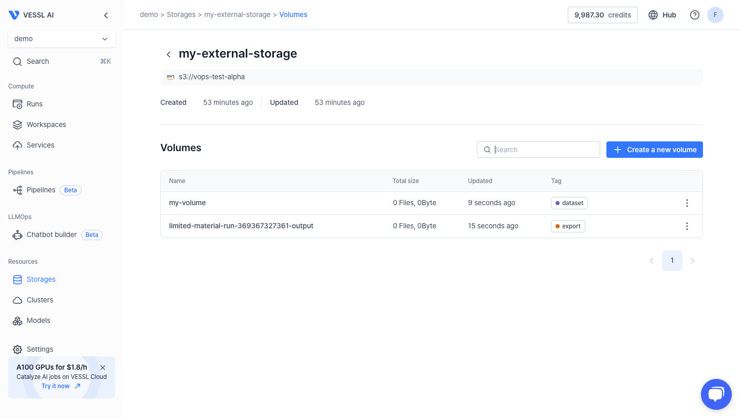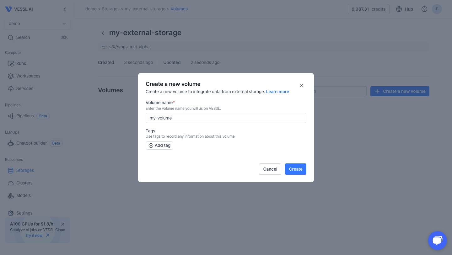 Similar to VESSL Storage, you can tag external storage volumes for easy search and retrieval. Tags are supported across both cloud and on-premises storage, ensuring a consistent experience.
