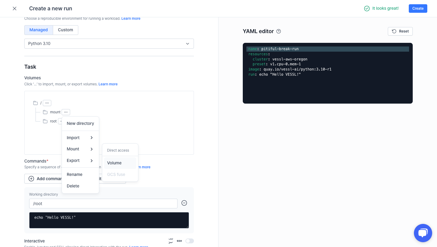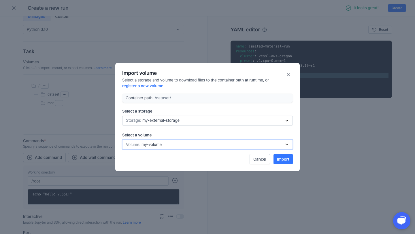 NFS volumes can be directly mounted to runs, reducing initialization time and making it ideal for large datasets.