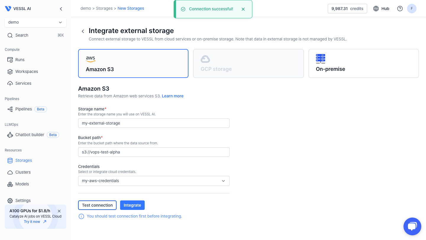 Integrating AWS S3 or Google Cloud Storage is straightforward. Navigate to Organization settings > Integrations and add your credentials.