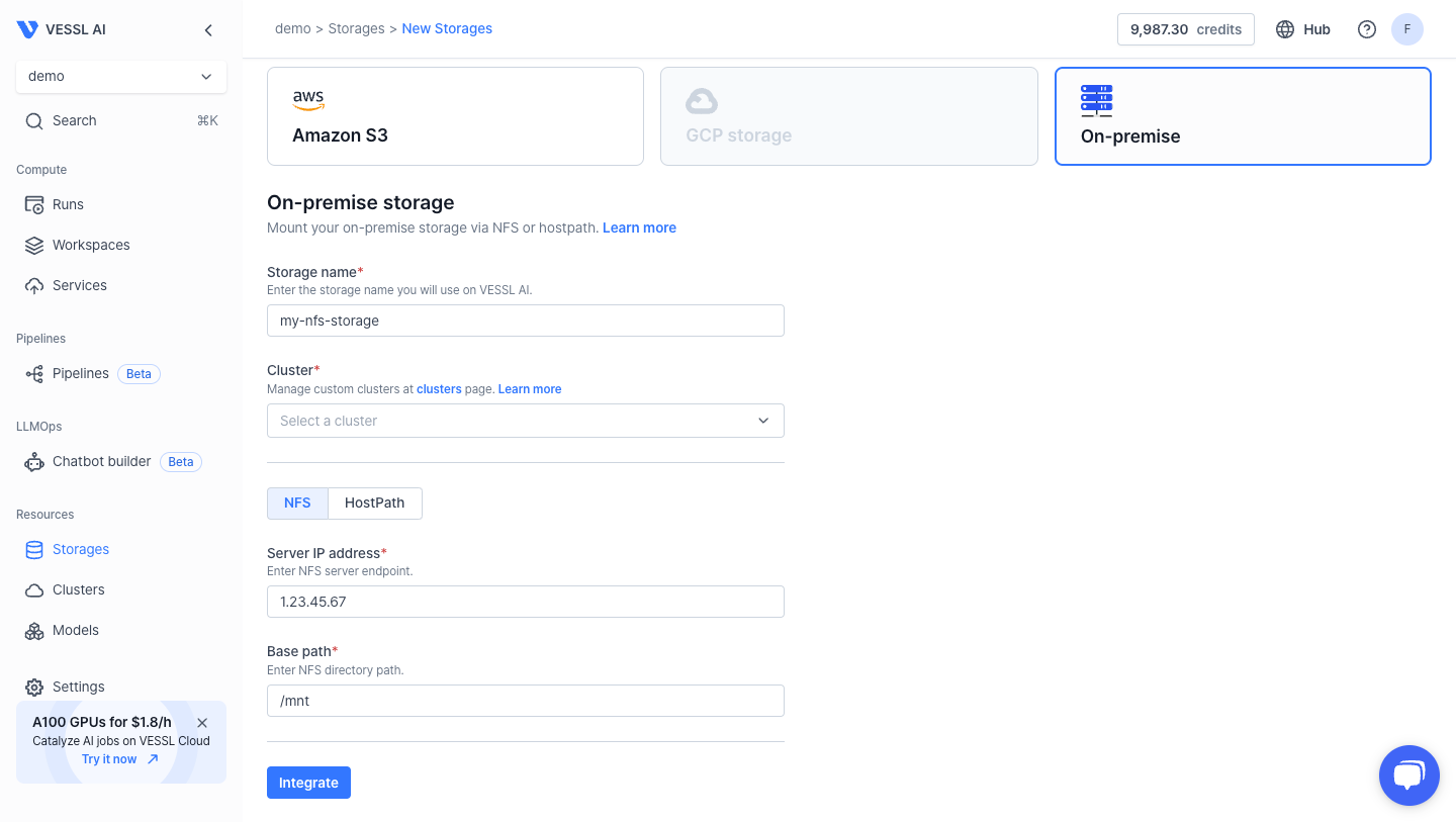 VESSL supports NFS (Network File System) and host path volumes for users who maintain on-premises storage solutions. You can integrate and use data from on-premises storage by following these steps:1