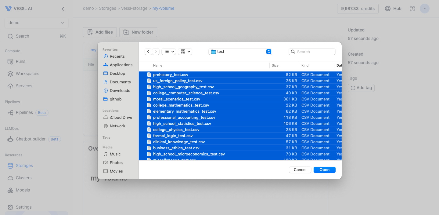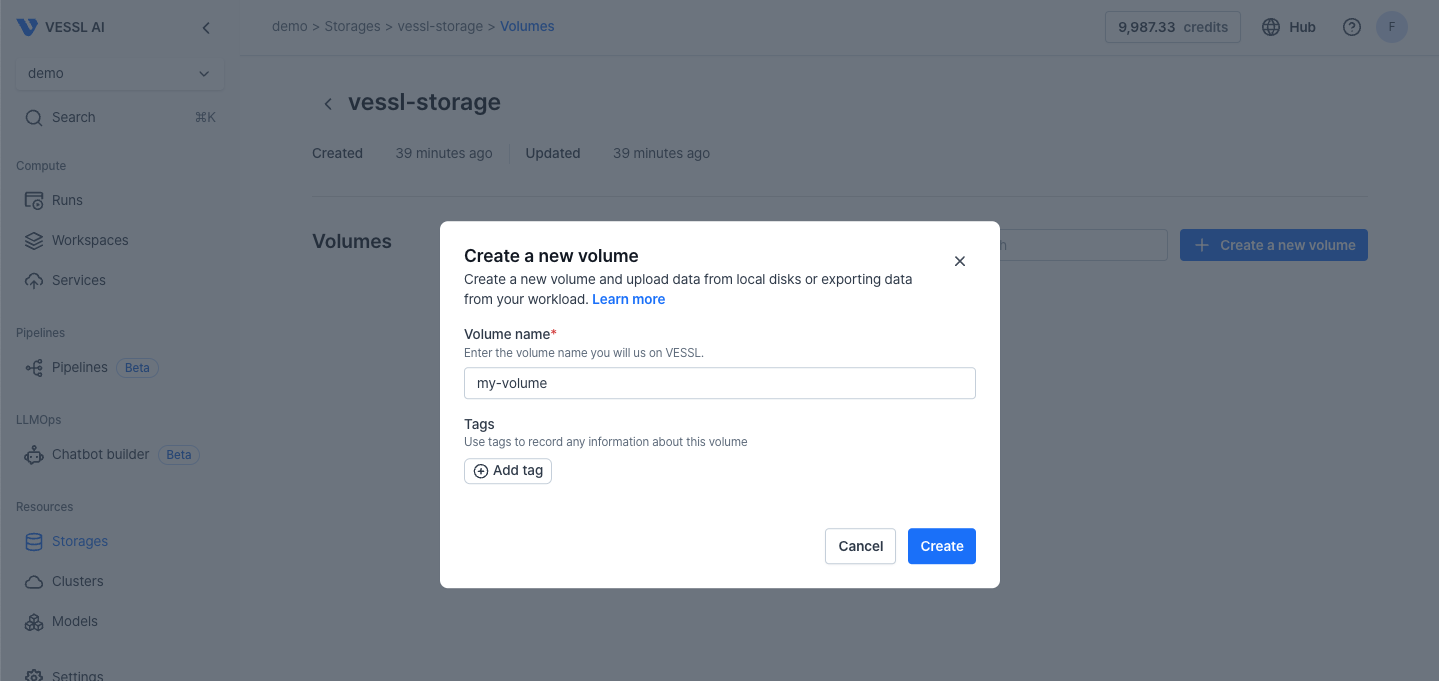 Creating a volume in VESSL Storage
