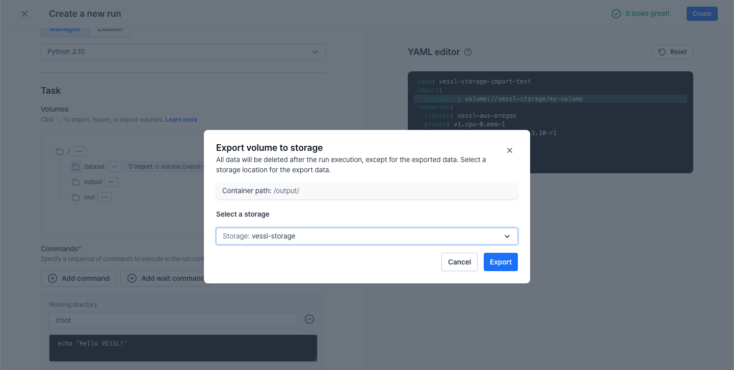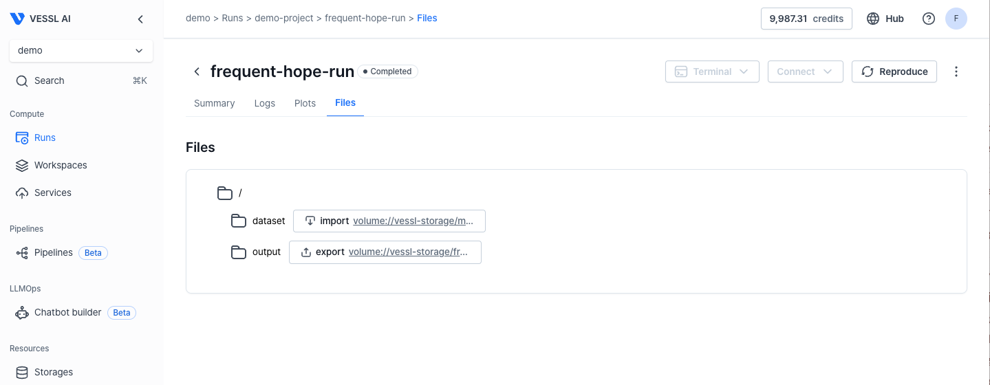 Follow the export volume link to access the volume in the VESSL Storage.