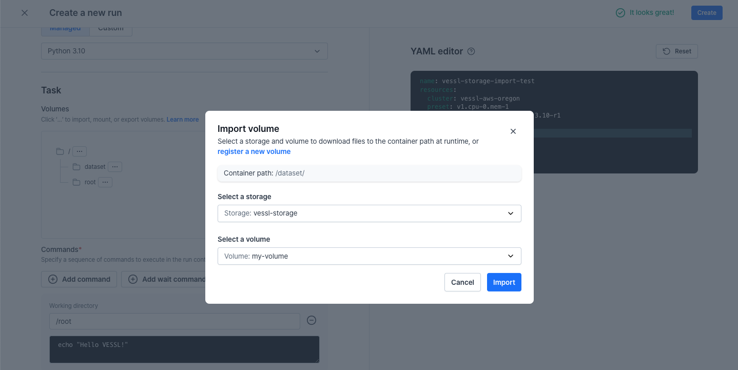/dataset), and import the volume of VESSL Storage as shown below.