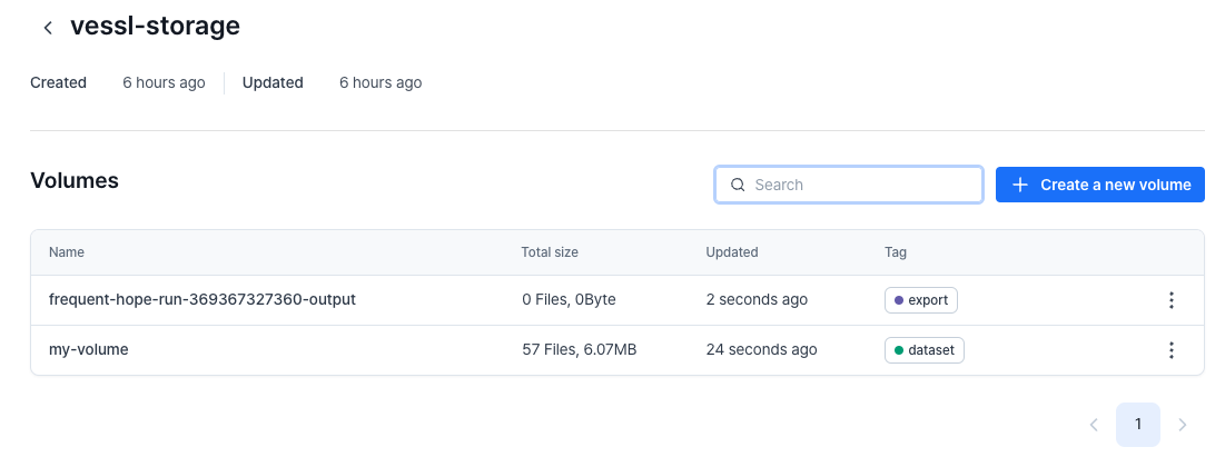 Volumes can also be created by a workload when exporting logs, checkpoints, and metrics to VESSL Storage. The volume name is automatically generated in this case.1